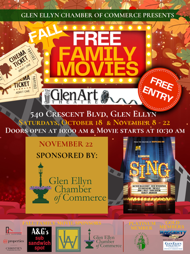 Enjoy a FREE movie, SING at the Glen Art Theatre sponsored by The Glen Ellyn Chamber.